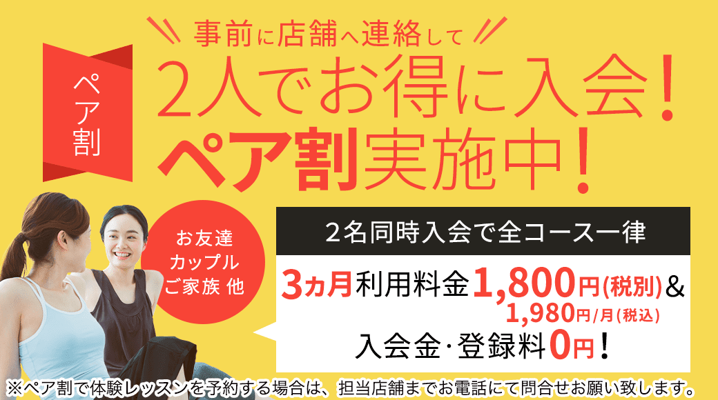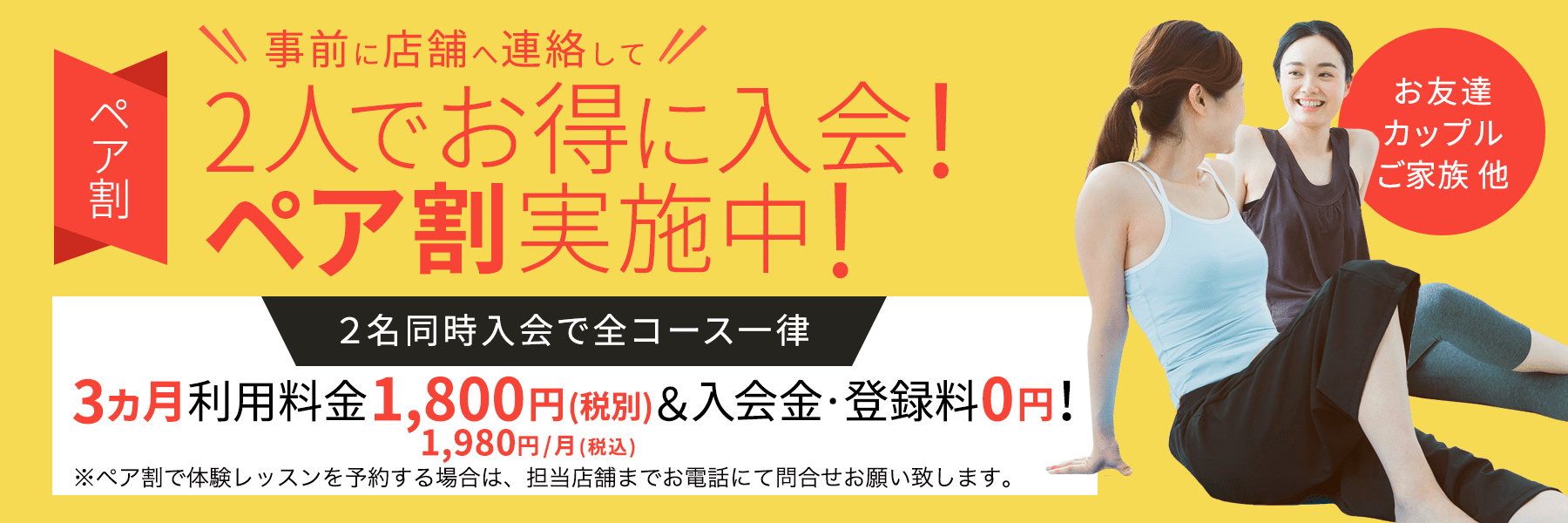 ※すべてのプランにヨガマット付きです。※契約は自動更新されます。 ※1日1レッスンまでの受講可。(但し、2レッスン目から別途、追加料金¥1,800(税込¥1,980)が発生します。) ※マンスリー4 の当月分のご利用回数は翌月15日まで繰越し可能とします。 ※入会後3ヵ月未満の解約はシステム上致しかねます。但し、キャンペーン期間中は、別に定める期間の継続が必要となります。 ※施設運営費として、毎月¥800(税込¥880)を頂戴致します。