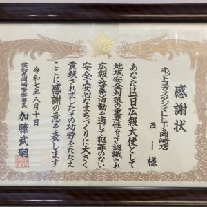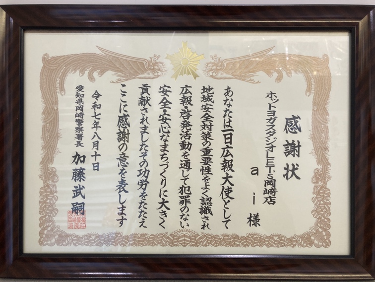 2025年8月10日に岡崎市警察署より一日広報大使を委任いただき